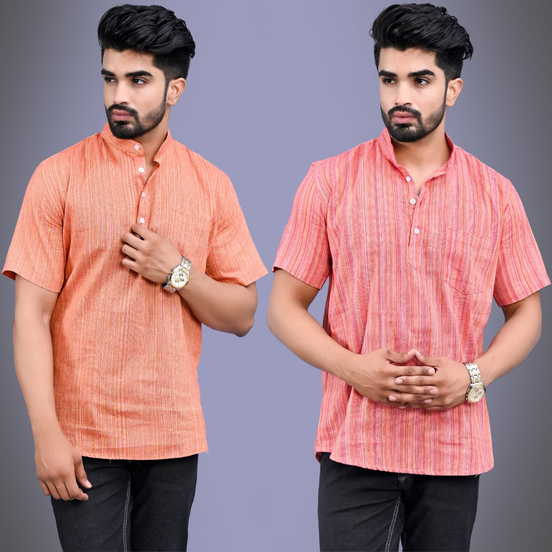 Pack Of 2 Mens Orange And Pink Multistripe Short Kurta Combo