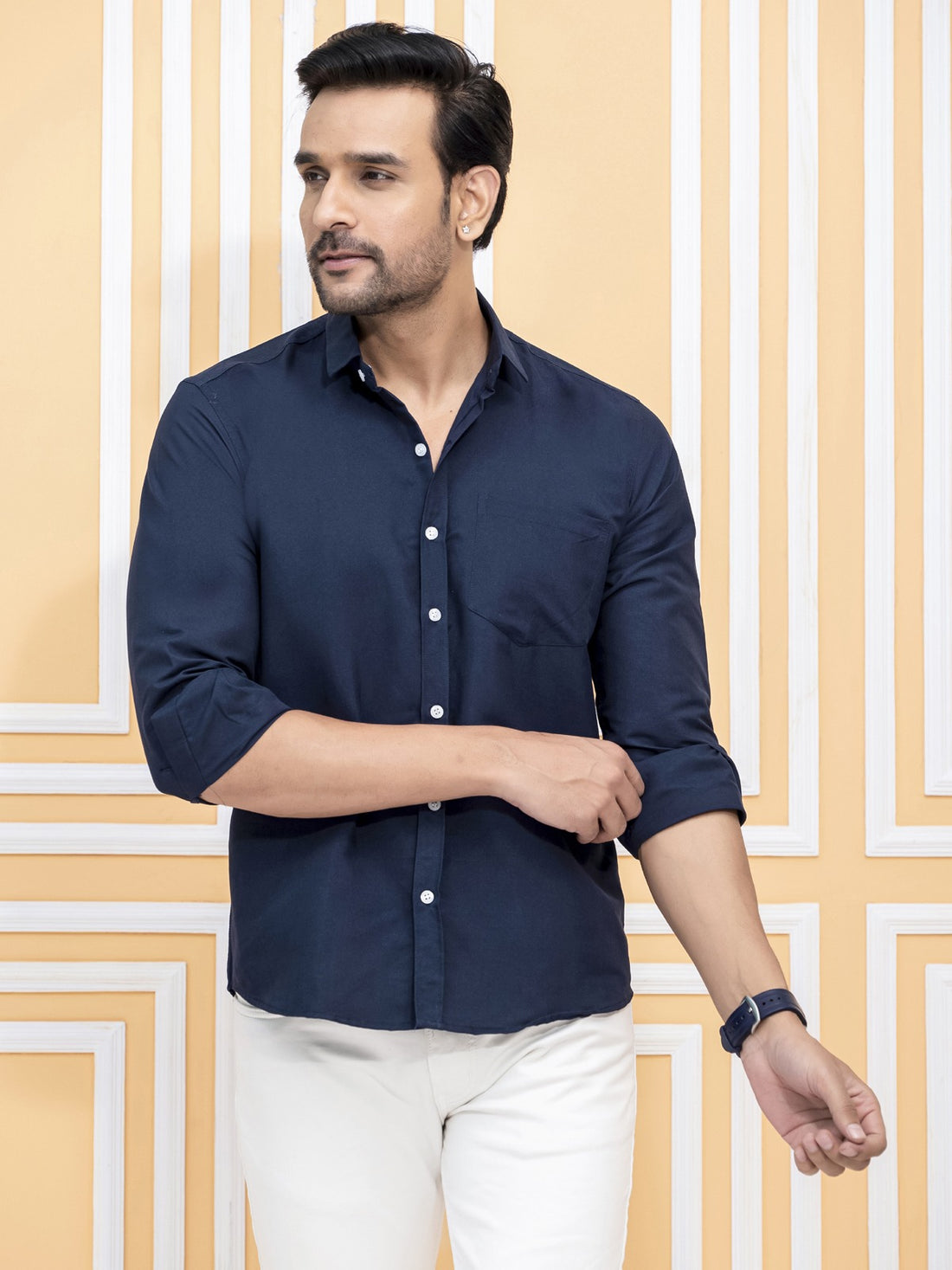 Mens Solid Navy Blue Full Sleeve Cotton Blend Shirt