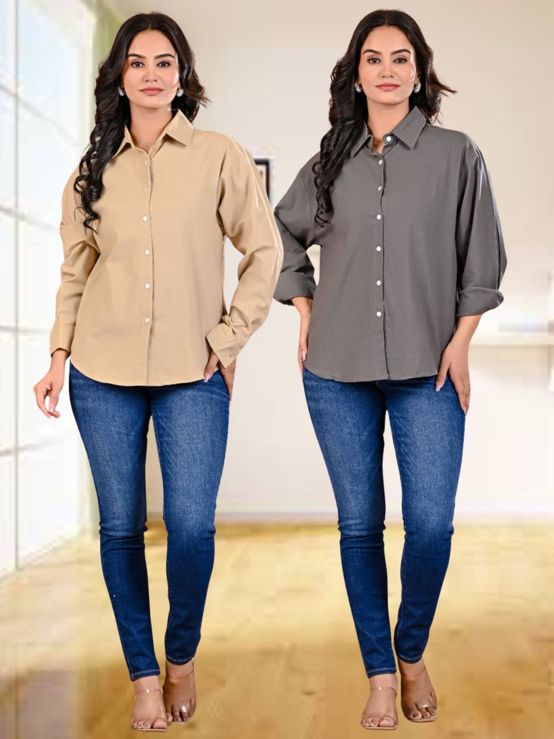 Pack Of 2 Womens Beige And Grey Cotton Loose Fit Shirt Combo