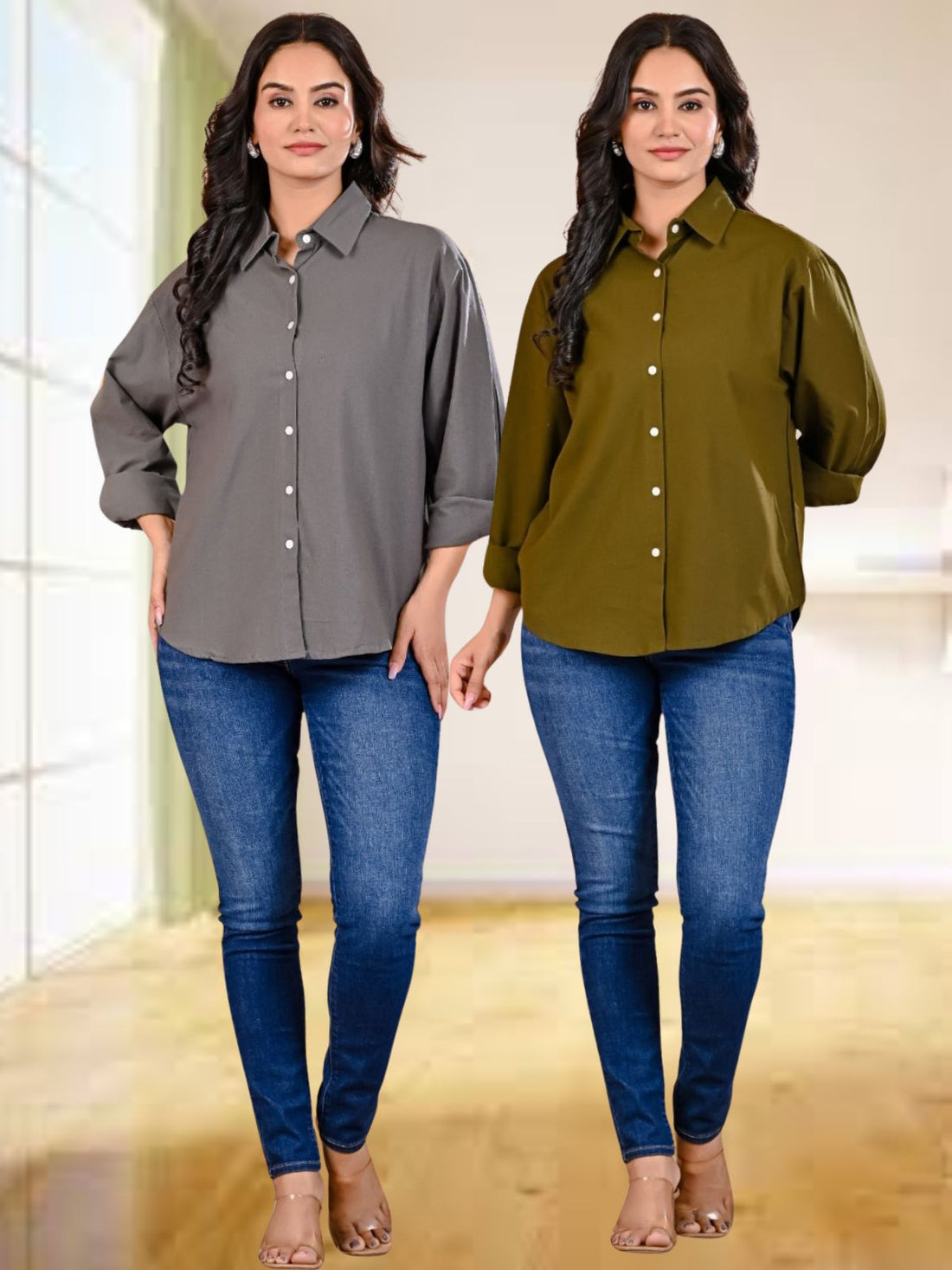 Pack Of 2 Womens Grey And Mehendi Green Cotton Loose Fit Shirt Combo