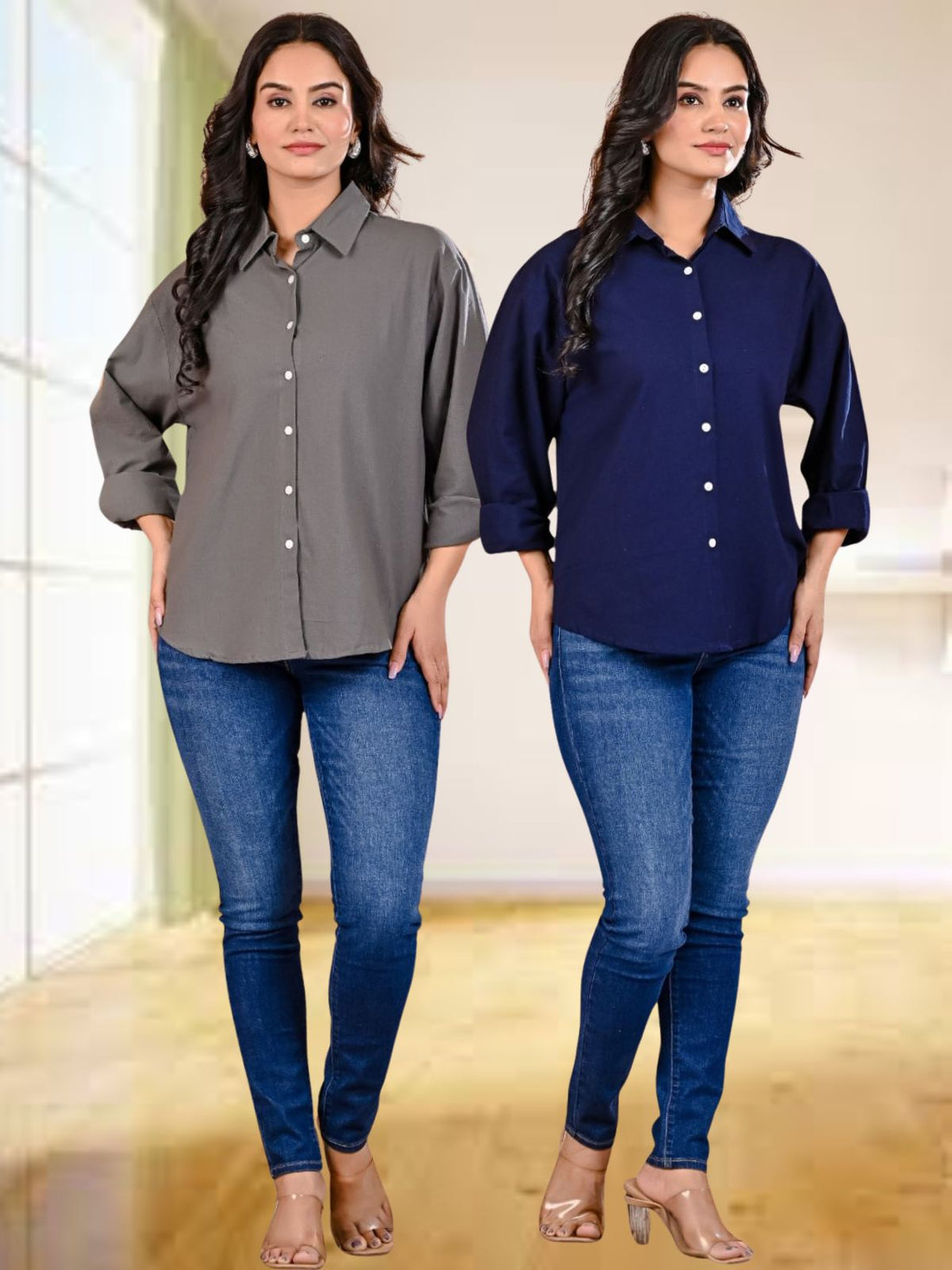Pack Of 2 Womens Grey And Navy Blue Cotton Loose Fit Shirt Combo