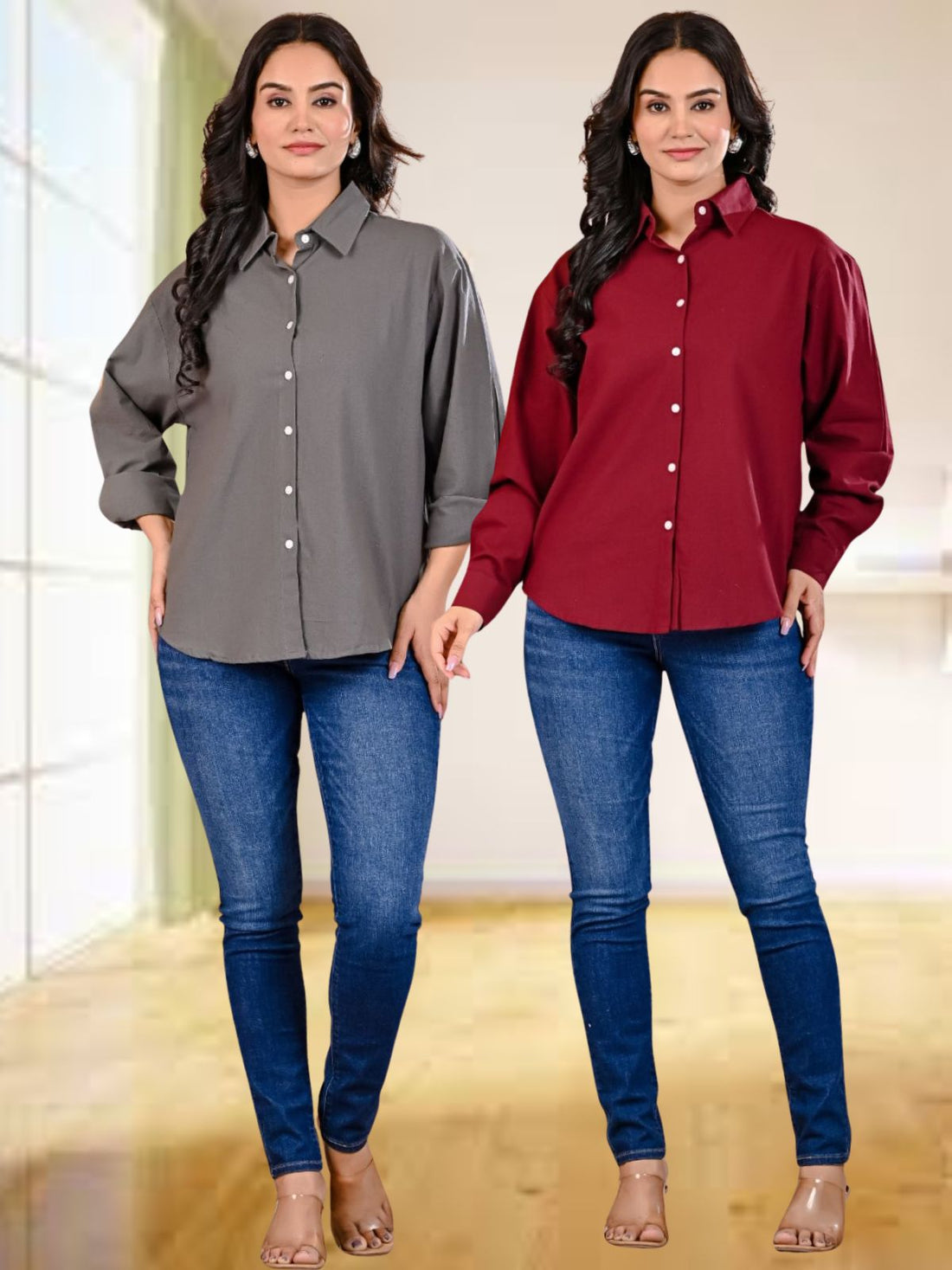 Pack Of 2 Womens Grey And Wine Cotton Loose Fit Shirt Combo