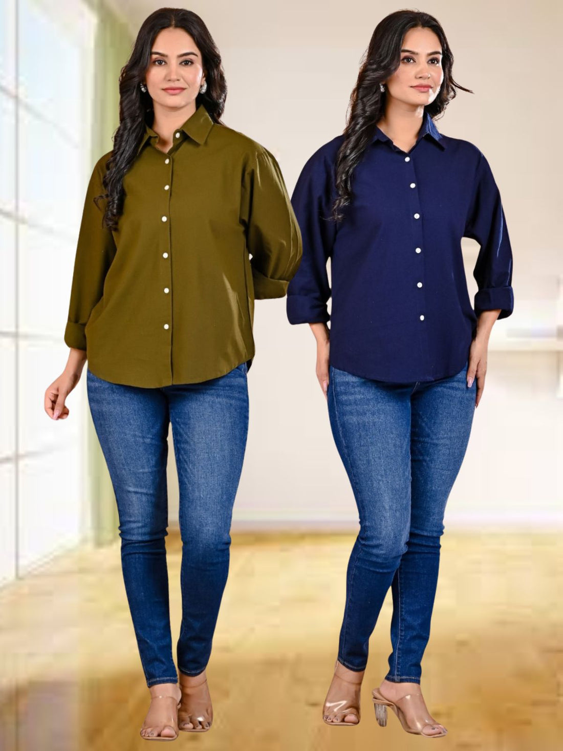 Pack Of 2 Womens Mehendi Green And Navy Blue Cotton Loose Fit Shirt Combo