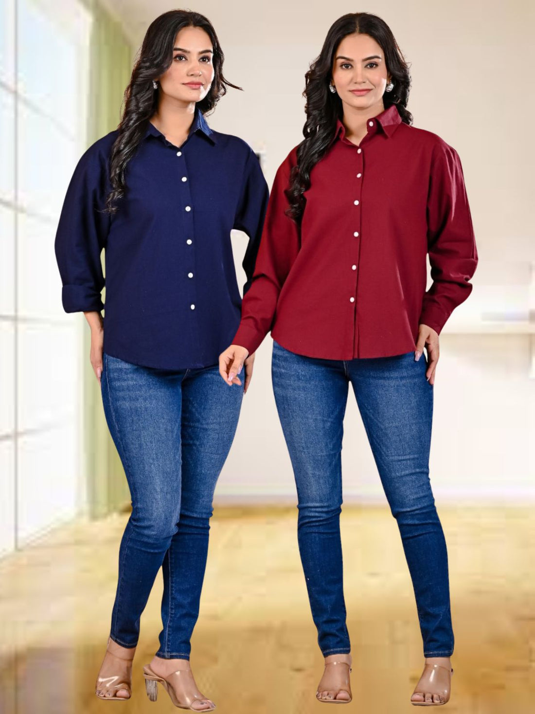 Pack Of 2 Womens Navy Blue And Wine Cotton Loose Fit Shirt Combo