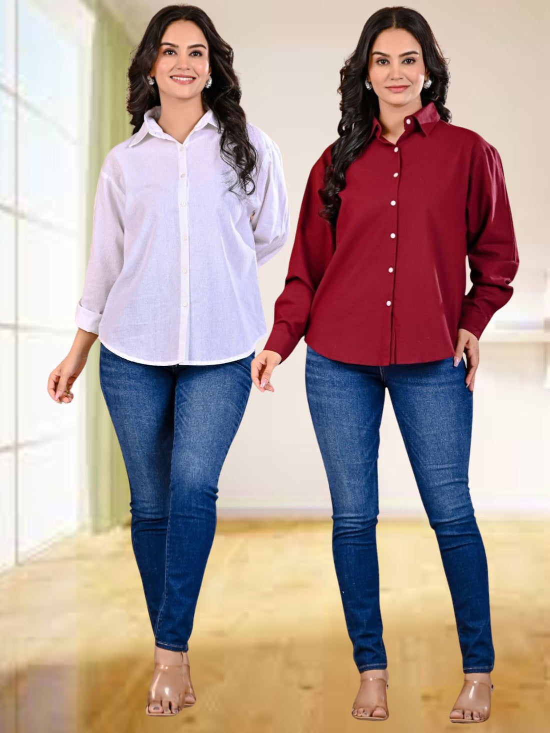 Pack Of 2 Womens White And Wine Cotton Loose Fit Shirt Combo