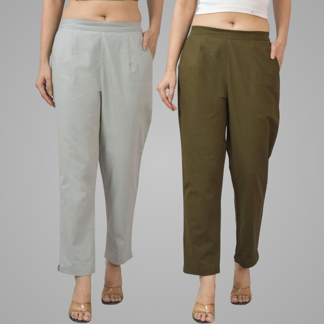 Pack Of 2 Womens Half Elastic Light Grey And Mehndi Green Deep Pocket Cotton Pants