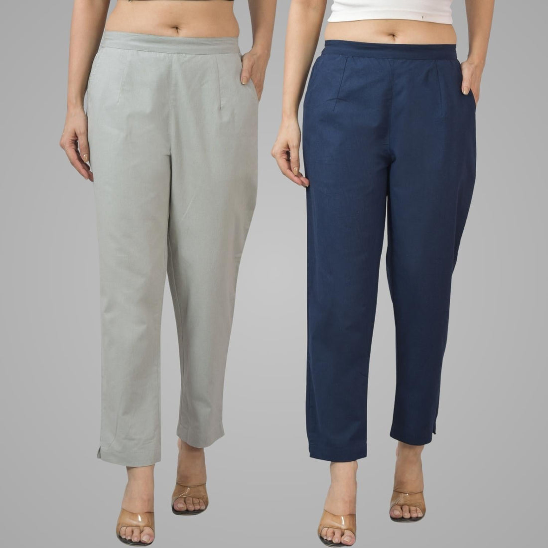 Pack Of 2 Womens Half Elastic Light Grey And Navy Blue Deep Pocket Cotton Pants
