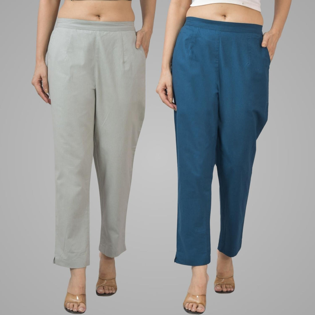 Pack Of 2 Womens Half Elastic Light Grey And Teal Blue Deep Pocket Cotton Pants