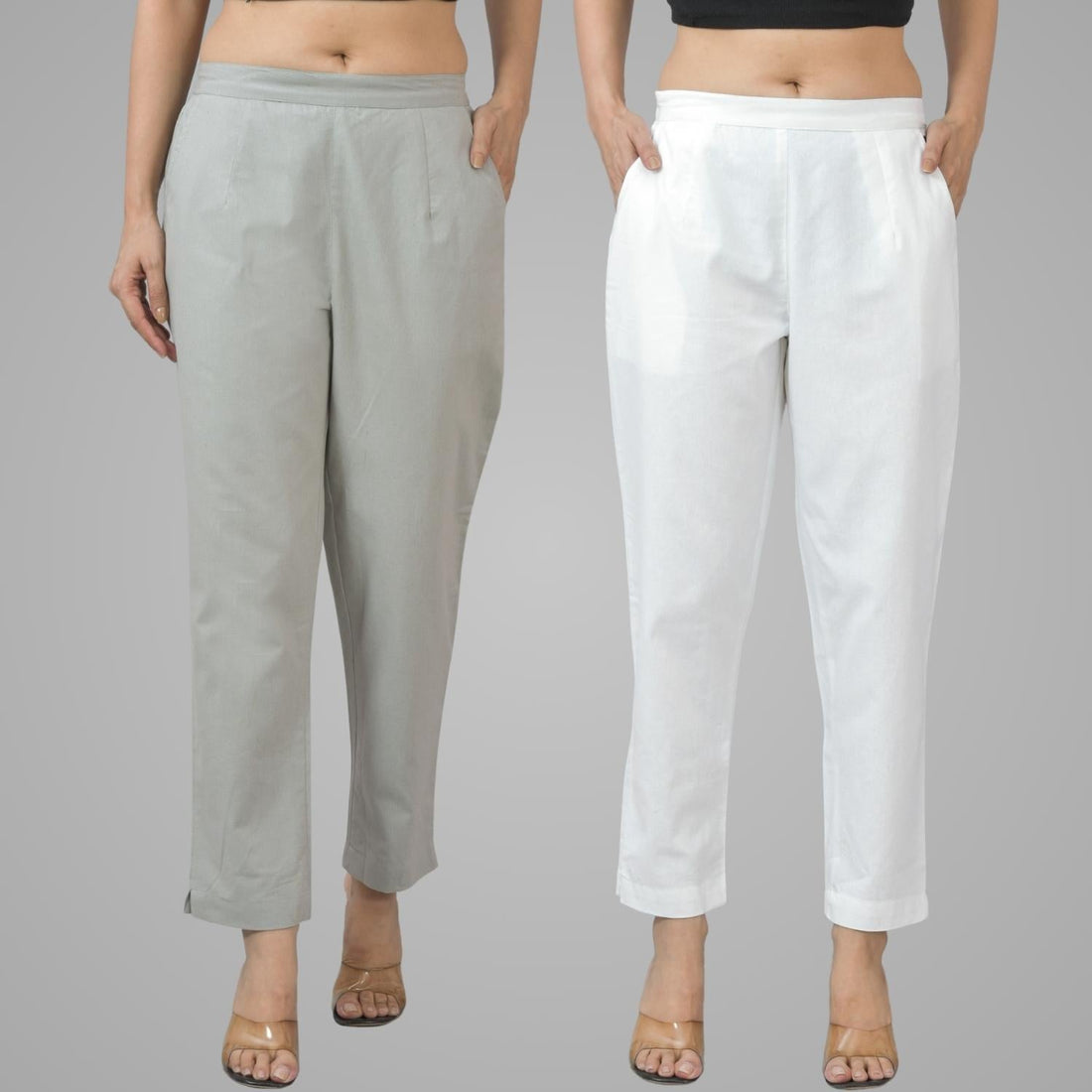 Pack Of 2 Womens Half Elastic Light Grey And White Deep Pocket Cotton Pants