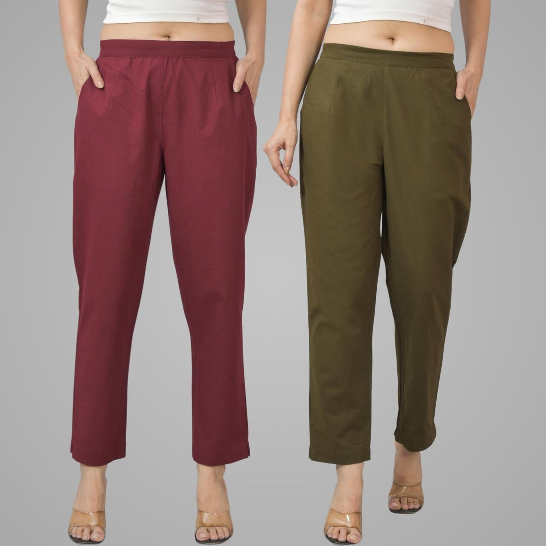 Pack Of 2 Womens Half Elastic Maroon And Mehndi Green Deep Pocket Cotton Pants
