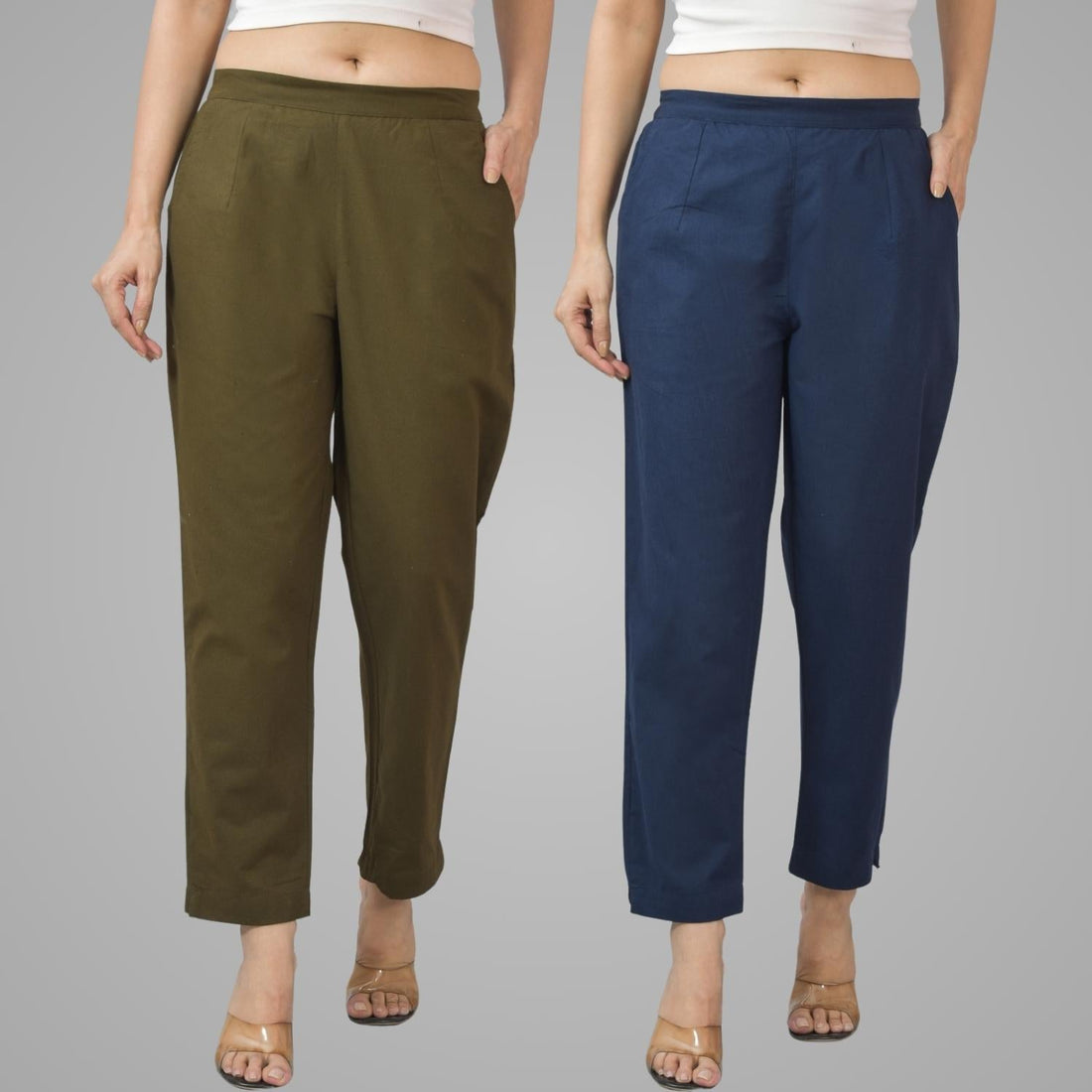 Pack Of 2 Womens Half Elastic Mehndi Green And Navy Blue Deep Pocket Cotton Pants