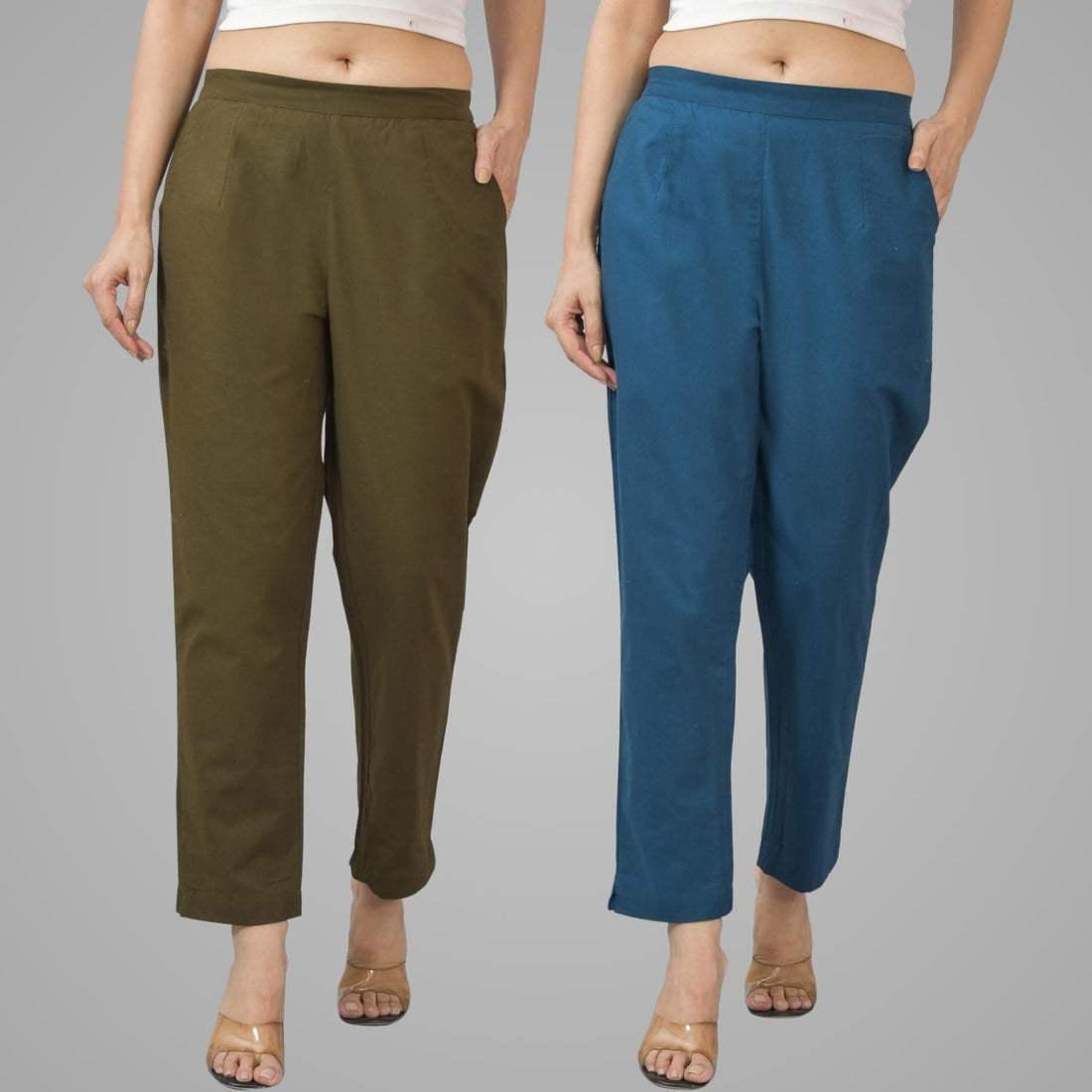 Pack Of 2 Womens Half Elastic Mehndi Green And Teal Blue Deep Pocket Cotton Pants