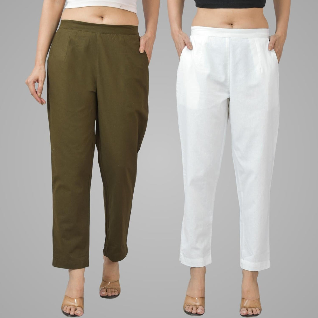 Pack Of 2 Womens Half Elastic Mehndi Green And White Deep Pocket Cotton Pants