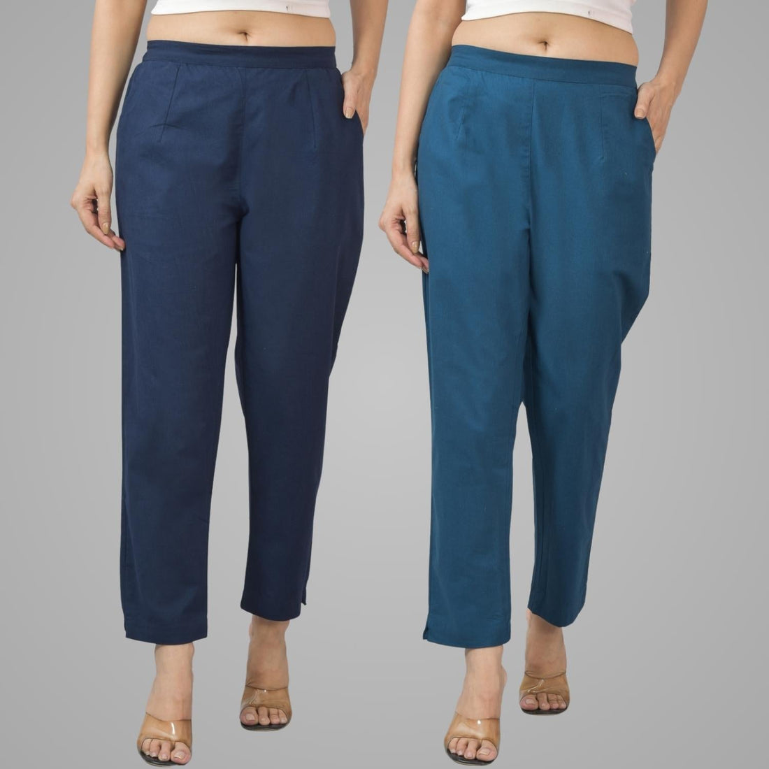 Pack Of 2 Womens Half Elastic Navy Blue And Teal Blue Deep Pocket Cotton Pants