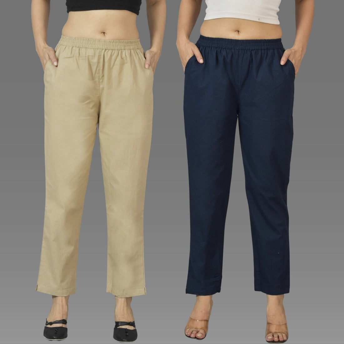Pack Of 2 Womens Beige And Navy Blue Deep Pocket Fully Elastic Cotton Trouser