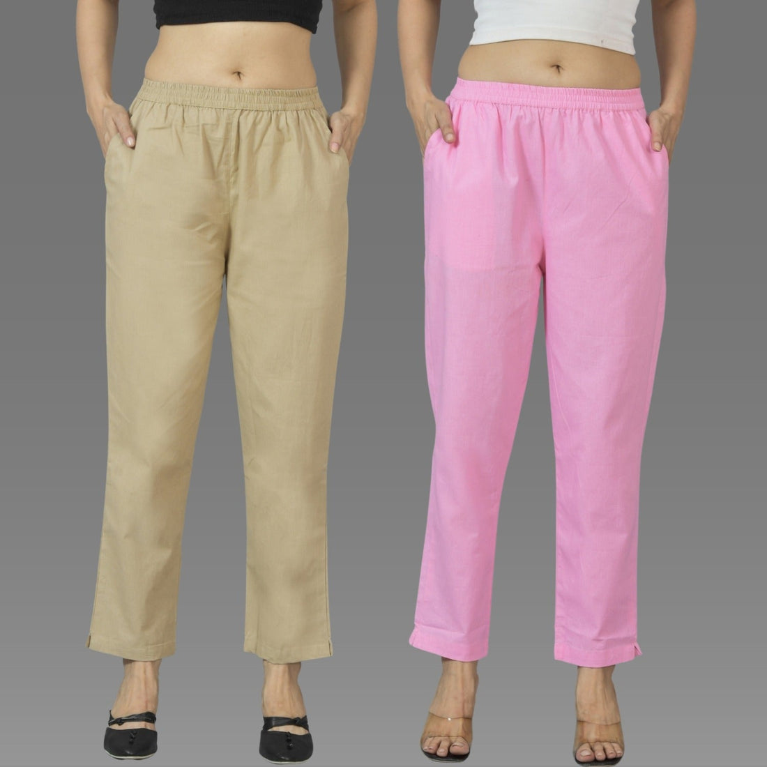 Pack Of 2 Womens Beige And Pink Deep Pocket Fully Elastic Cotton Trouser