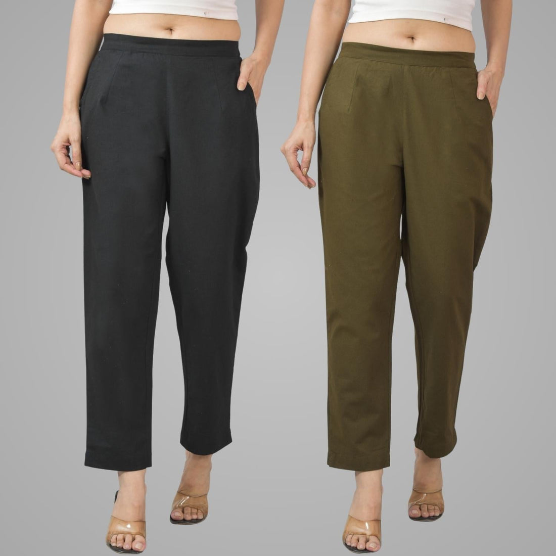 Pack Of 2 Womens Half Elastic Black And Mehndi Green Deep Pocket Cotton Pants
