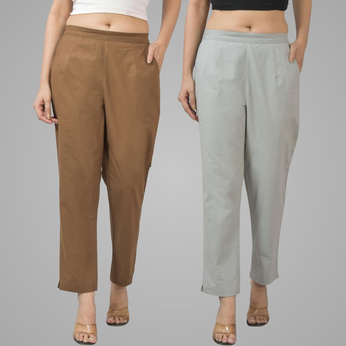 Pack Of 2 Womens Half Elastic Brown And Light Grey Deep Pocket Cotton Pants