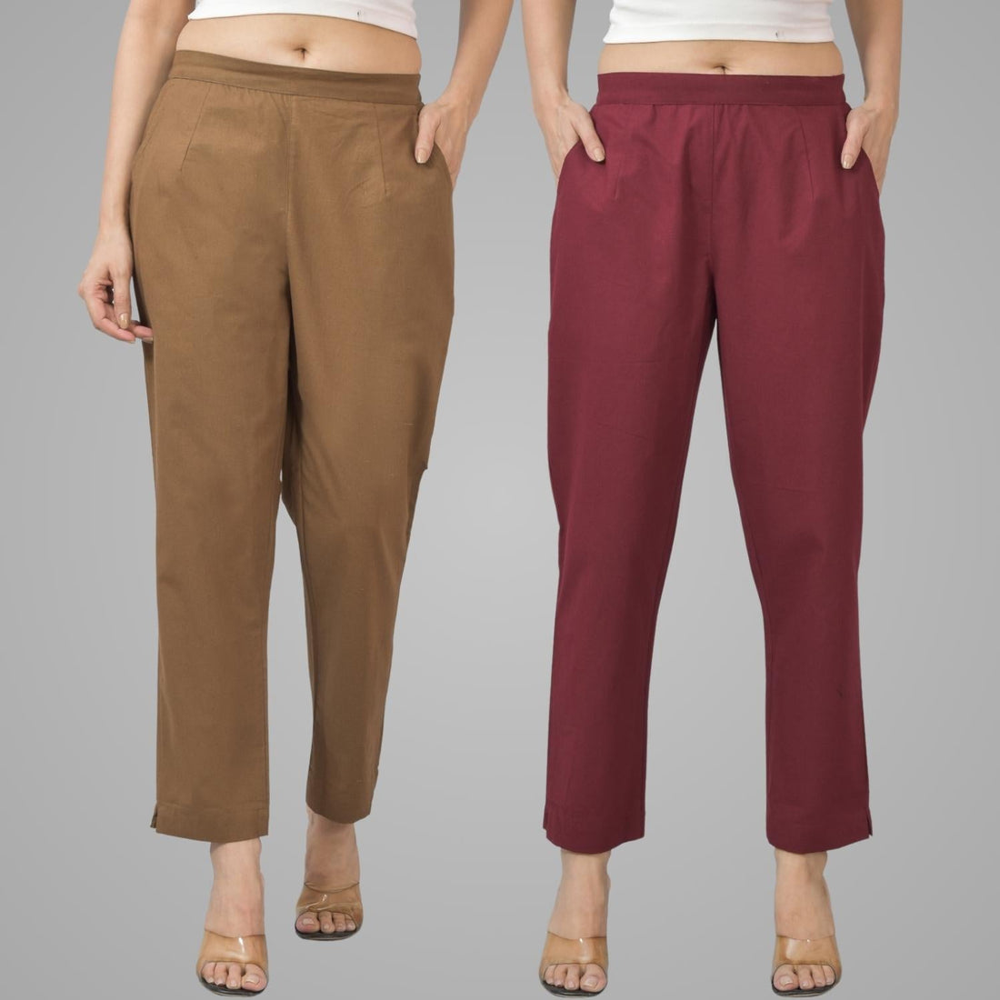 Pack Of 2 Womens Half Elastic Brown And Maroon Deep Pocket Cotton Pants