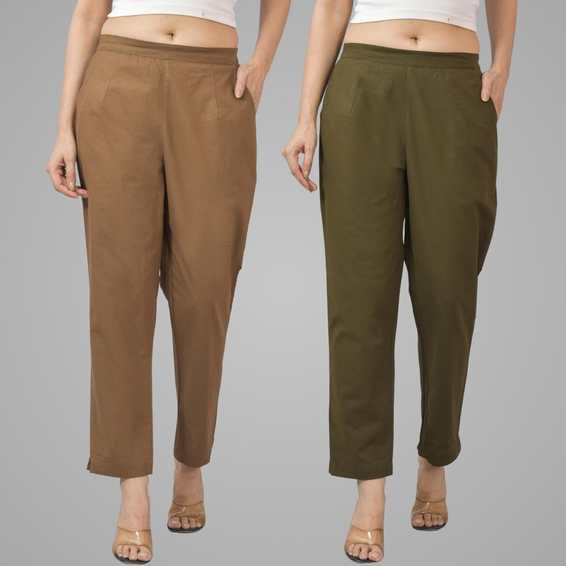 Pack Of 2 Womens Half Elastic Brown And Mehndi Green Deep Pocket Cotton Pants