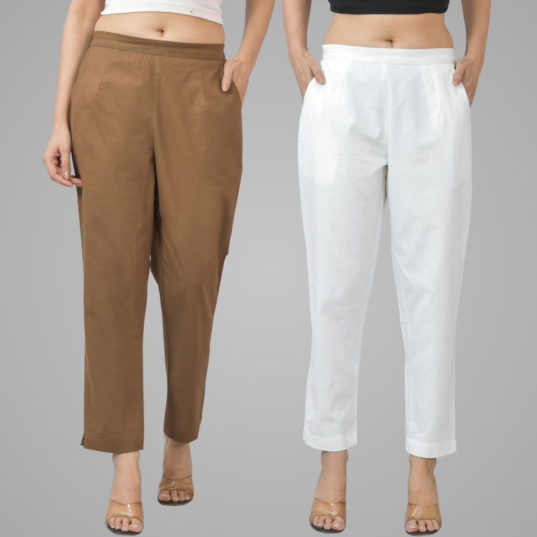 Pack Of 2 Womens Half Elastic Brown And White Deep Pocket Cotton Pants