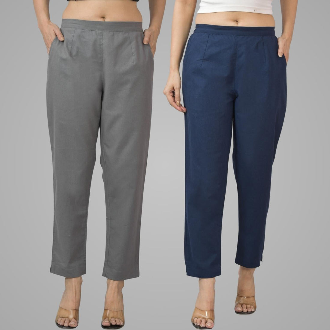 Pack Of 2 Womens Half Elastic Grey And Navy Blue Deep Pocket Cotton Pants