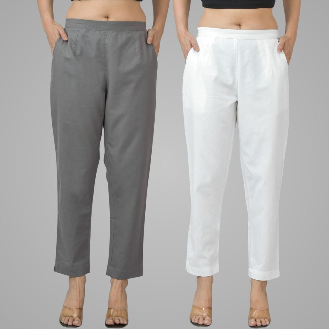 Pack Of 2 Womens Half Elastic Grey And White Deep Pocket Cotton Pants