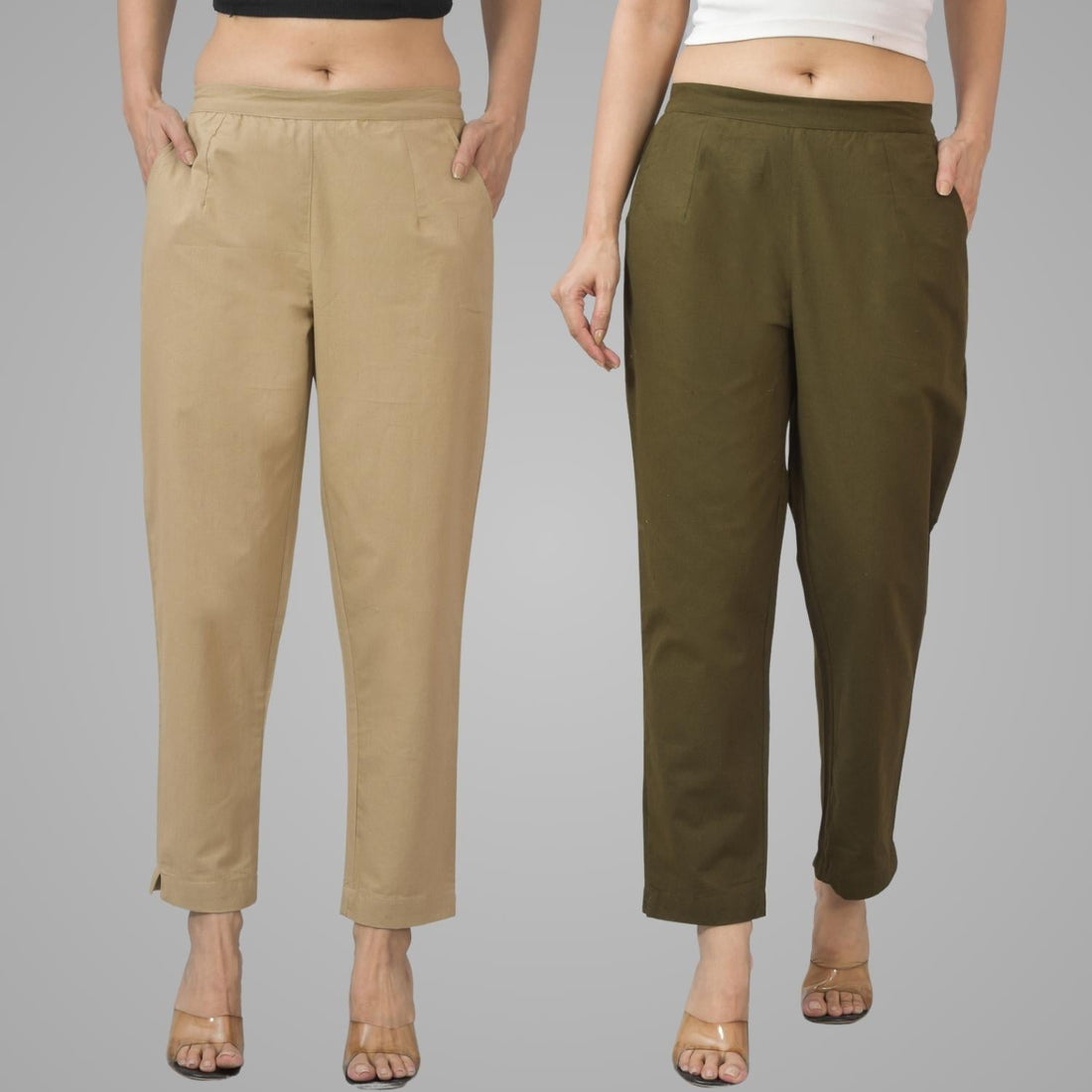 Pack Of 2 Womens Half Elastic Beige And Mehndi Green Deep Pocket Cotton Pants
