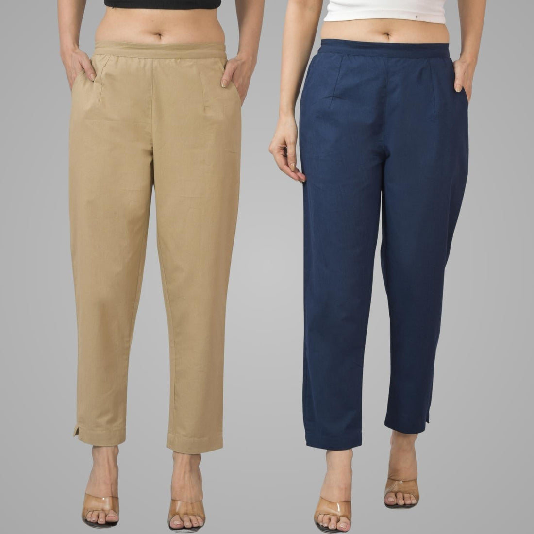 Pack Of 2 Womens Half Elastic Beige And Navy Blue Deep Pocket Cotton Pants
