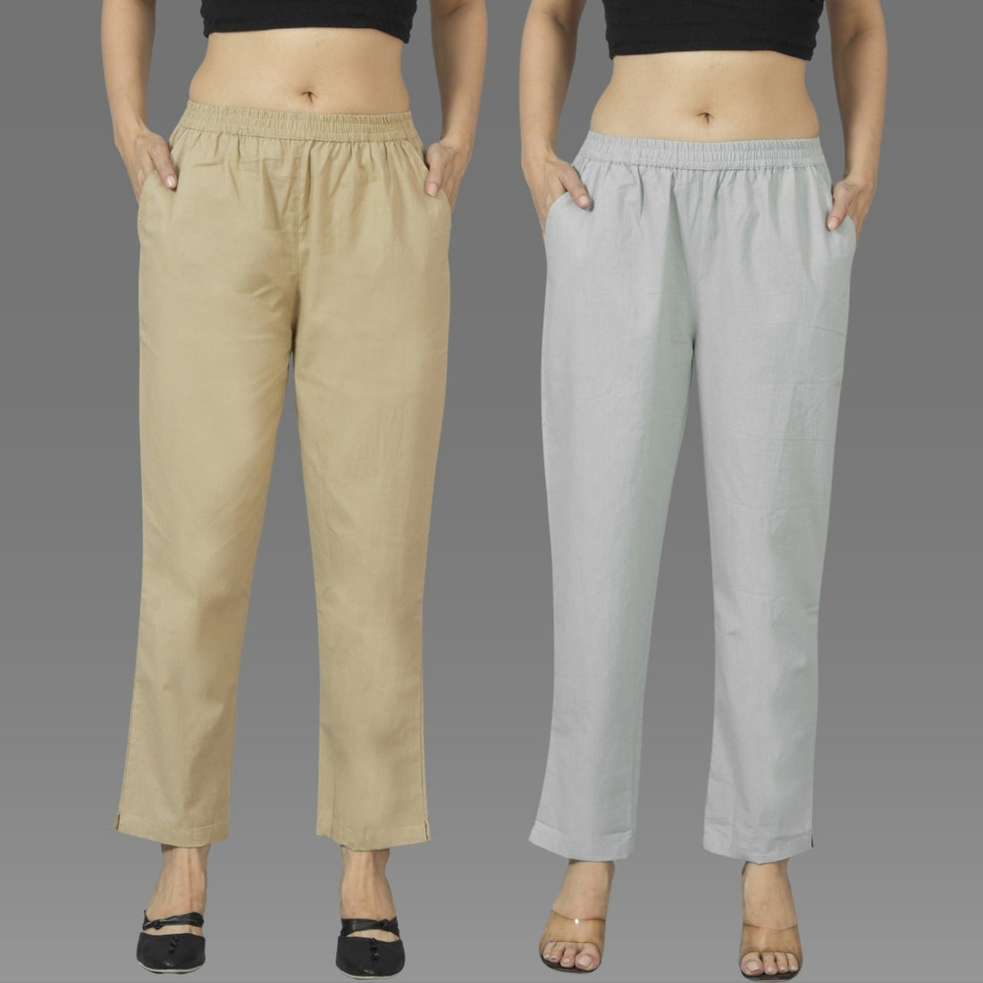 Pack Of 2 Womens Beige And Melange Grey Deep Pocket Fully Elastic Cotton Trouser