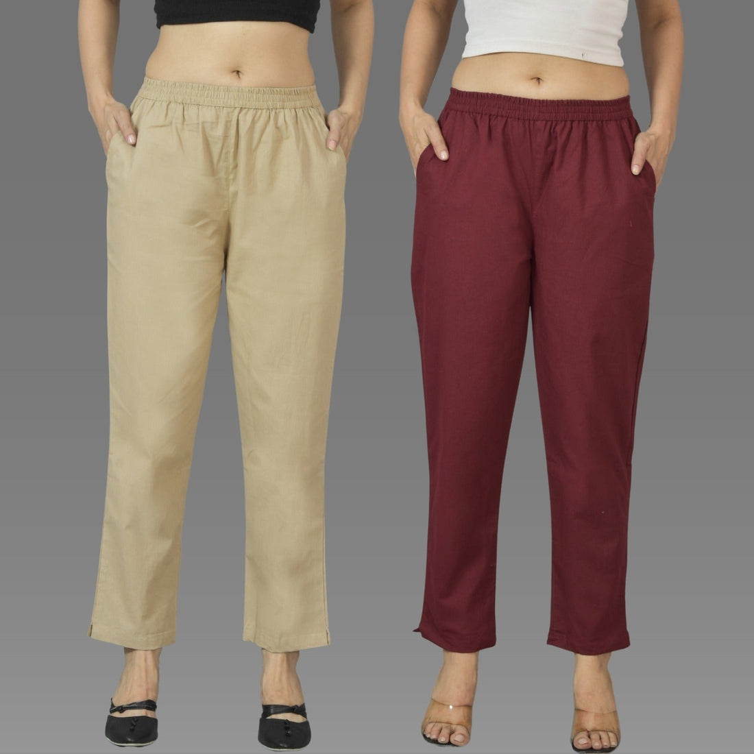 Pack Of 2 Womens Beige And Wine Deep Pocket Fully Elastic Cotton Trouser