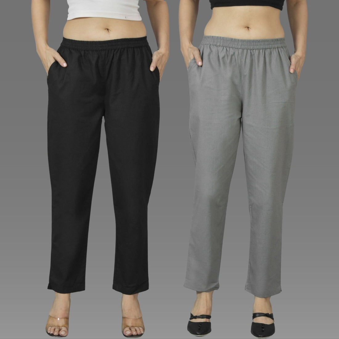 Pack Of 2 Womens Black And Grey Deep Pocket Fully Elastic Cotton Trouser