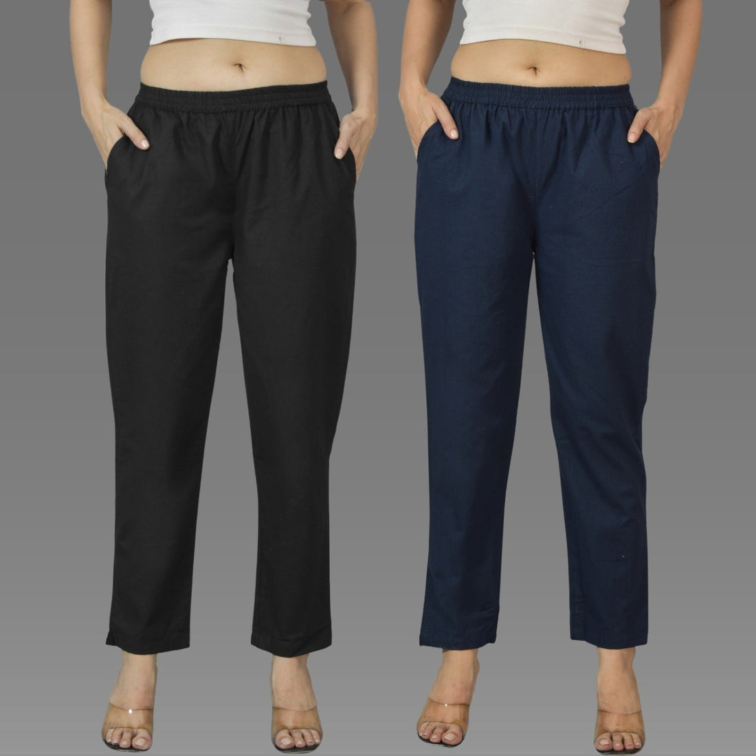 Pack Of 2 Womens Black And Navy Blue Deep Pocket Fully Elastic Cotton Trouser