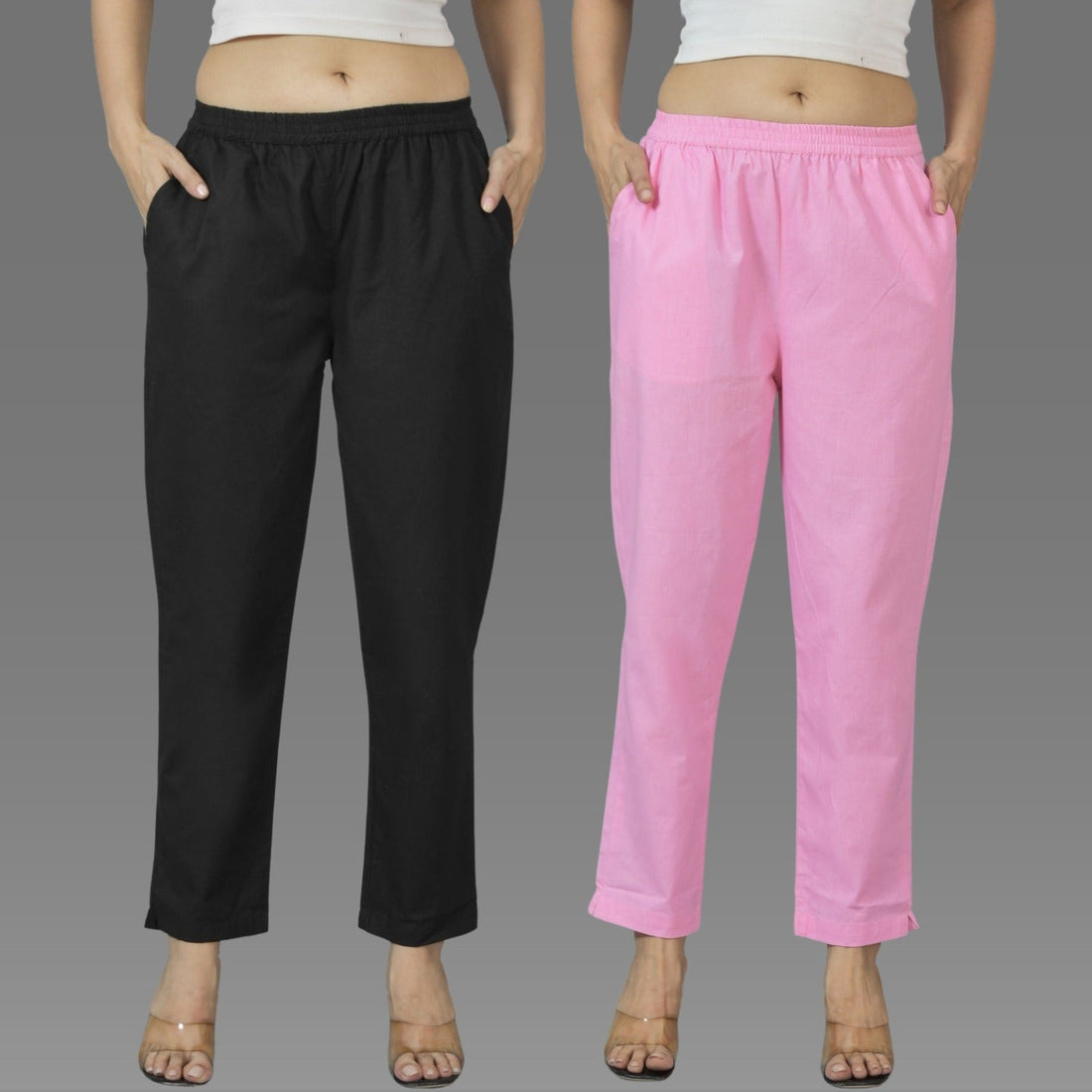 Pack Of 2 Womens Black And Pink Deep Pocket Fully Elastic Cotton Trouser