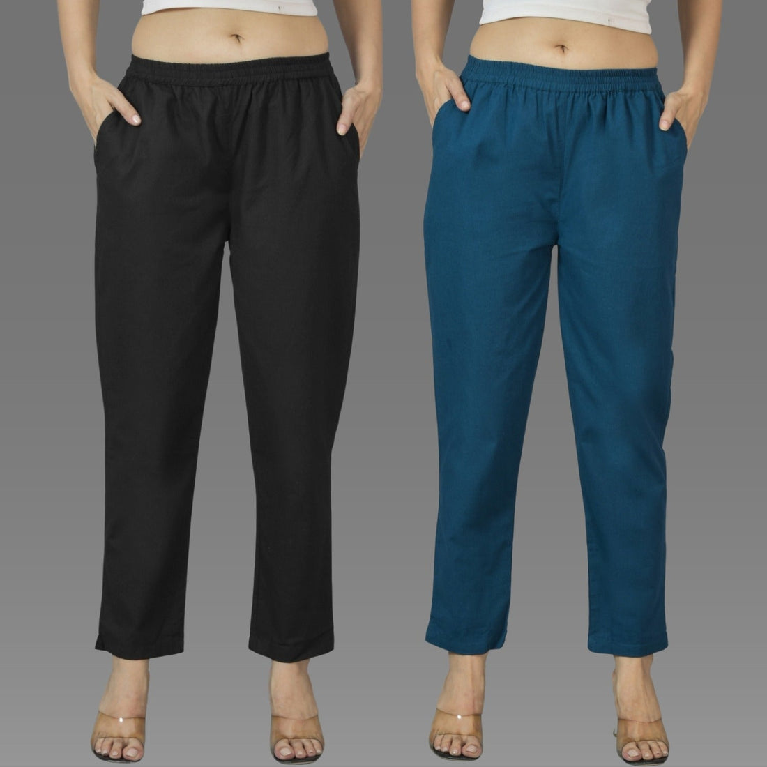 Pack Of 2 Womens Black And Teal Blue Deep Pocket Fully Elastic Cotton Trouser