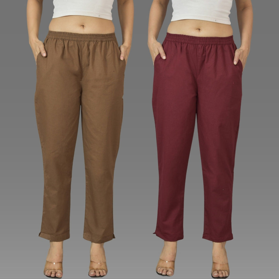 Pack Of 2 Womens Brown And Wine Deep Pocket Fully Elastic Cotton Trouser