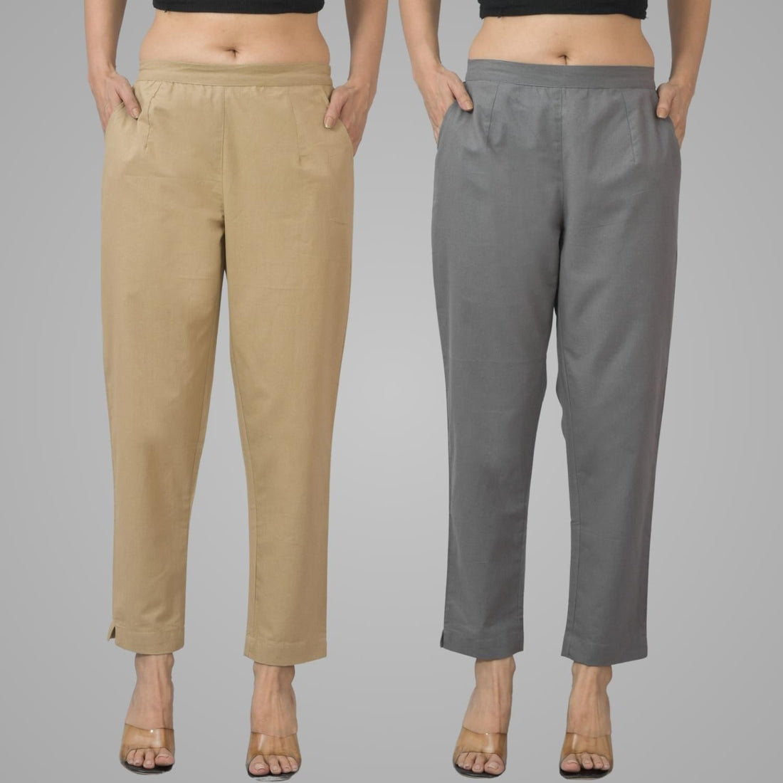 Pack Of 2 Womens Half Elastic Beige And Grey Deep Pocket Cotton Pants