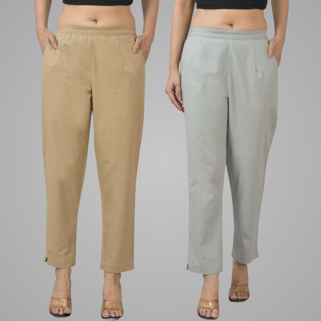 Pack Of 2 Womens Half Elastic Beige And Light Grey Deep Pocket Cotton Pants