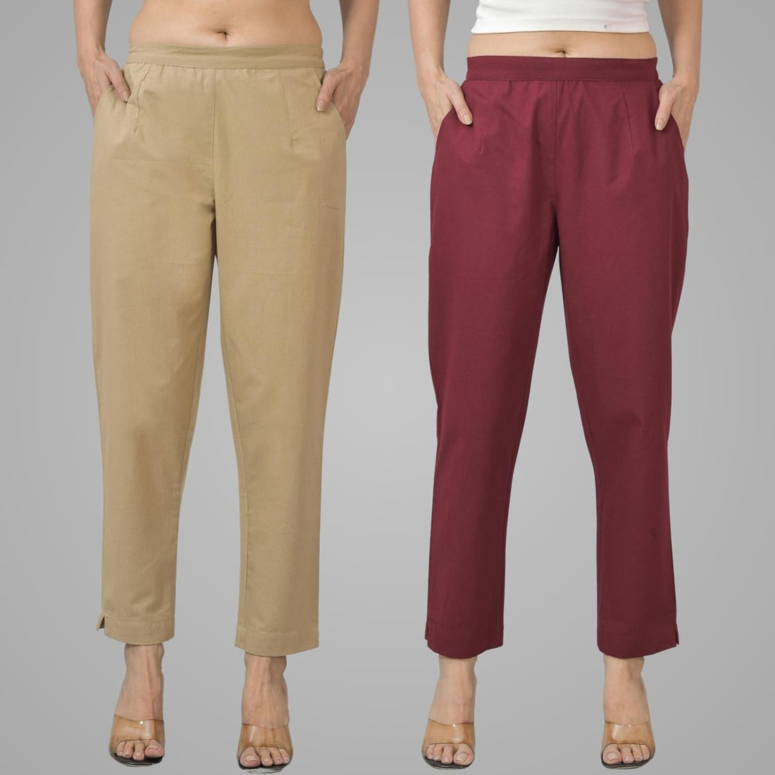 Pack Of 2 Womens Half Elastic Beige And Maroon Deep Pocket Cotton Pants