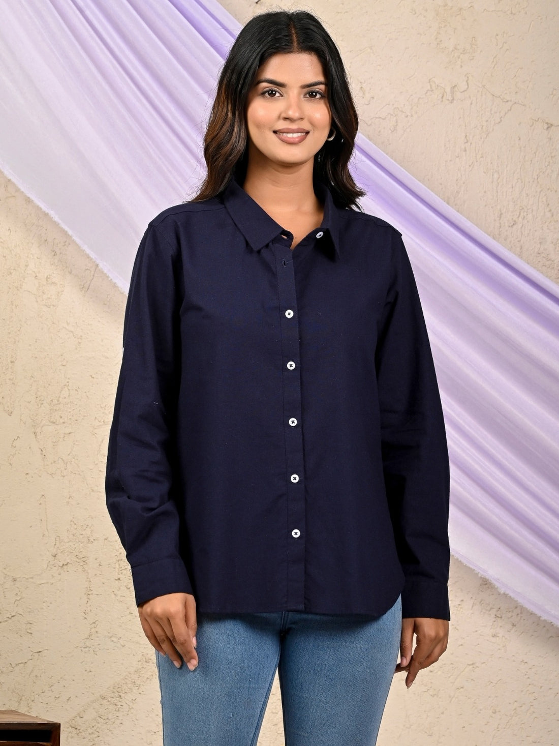 Womens Solid Navy Blue Airy Linen Cotton Shirt