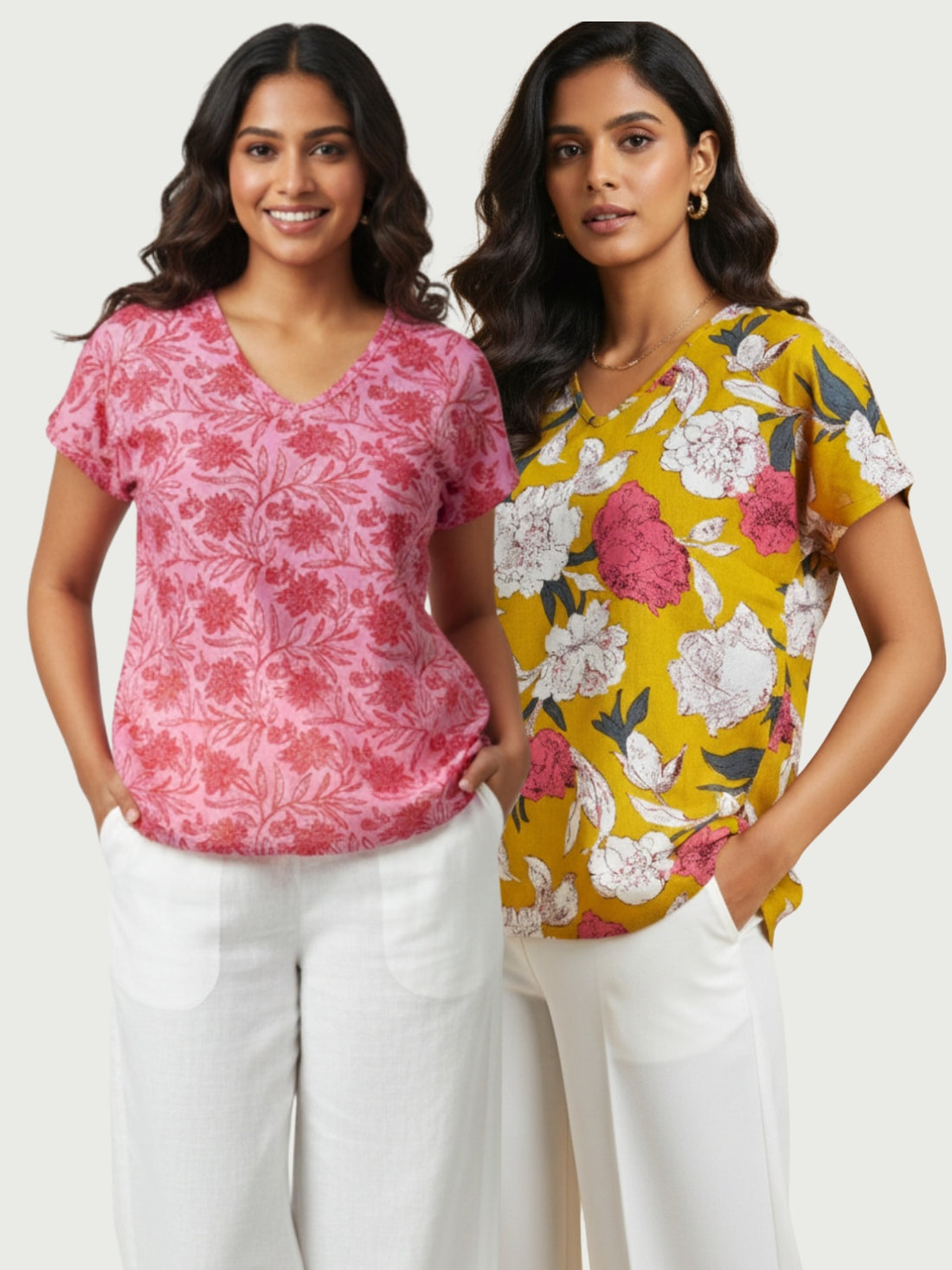 Pack Of 2 WomenS Pink And Yellow Airy Linen Cotton Printed Tops
