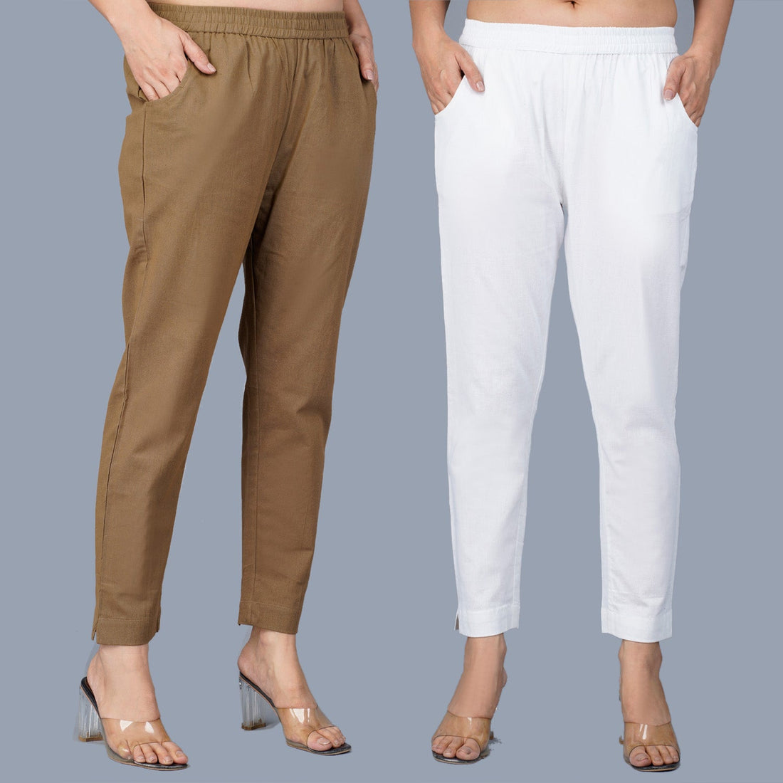 Pack Of 2 Womens Regular Fit Brown And White Fully Elastic Waistband Cotton Trouser