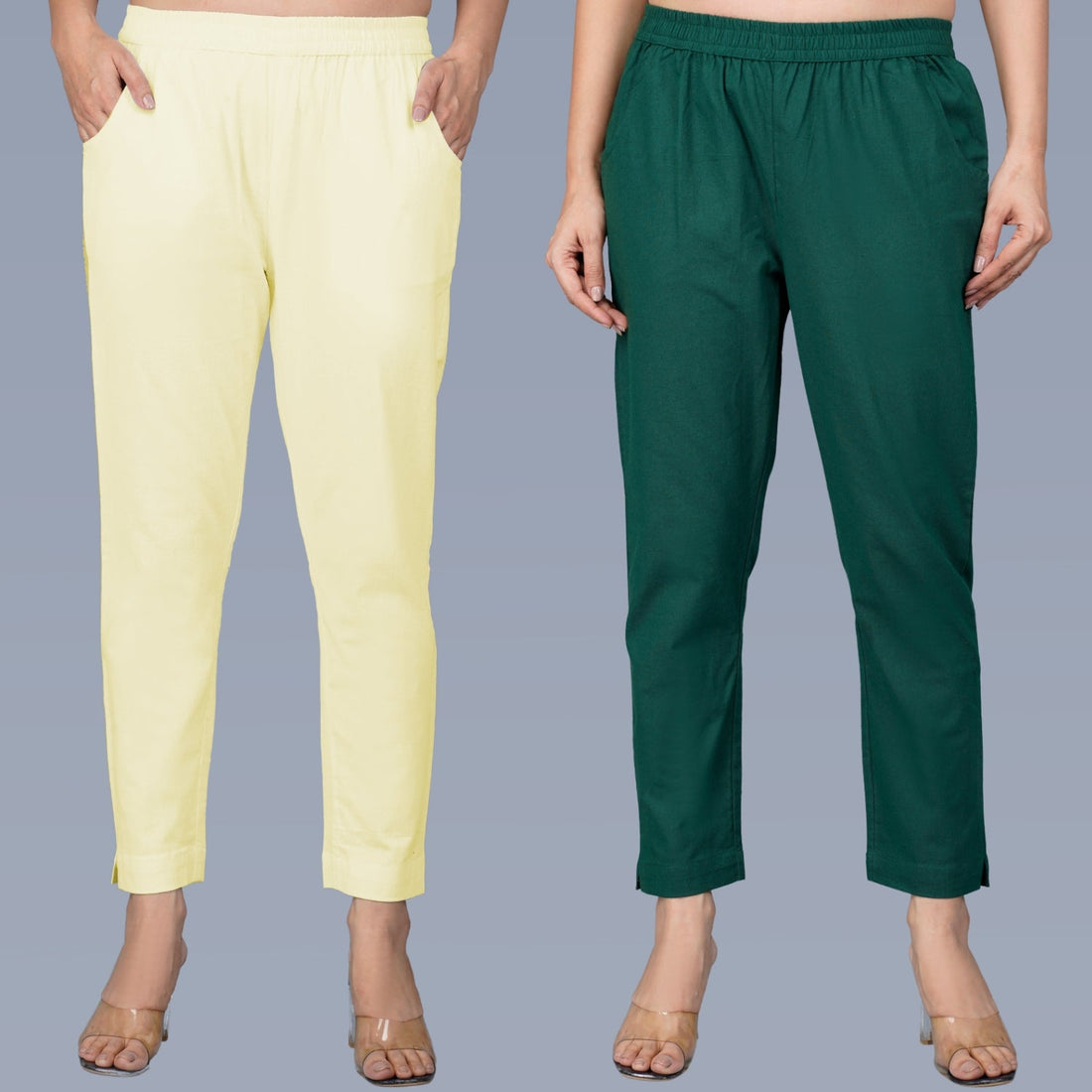 Pack Of 2 Womens Regular Fit Denim Blue And Bottle Green Fully Elastic Waistband Cotton Trouser