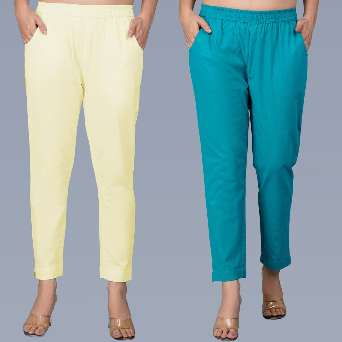 Pack Of 2 Womens Regular Fit Cream And Cyan Fully Elastic Waistband Cotton Trouser