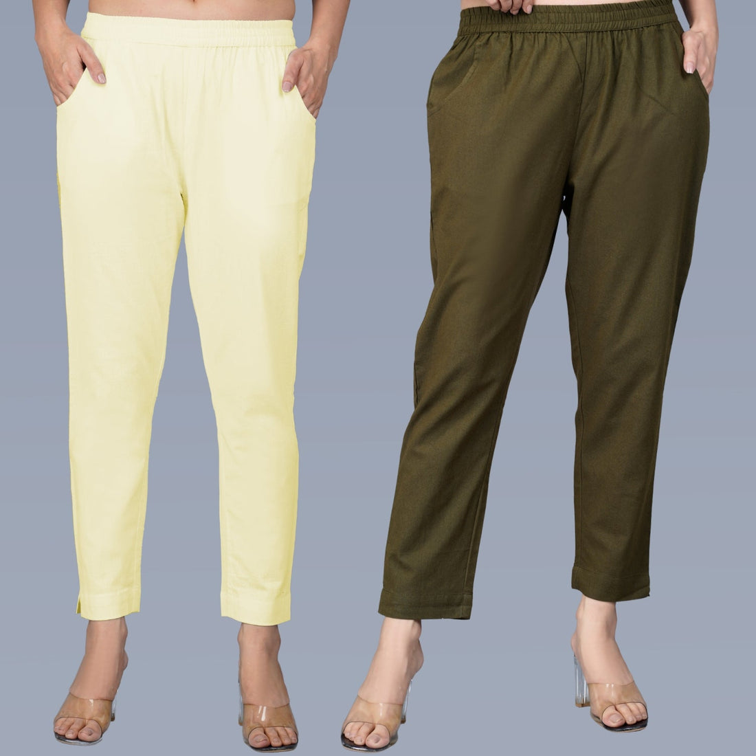Pack Of 2 Womens Regular Fit Cream And Dark Green Fully Elastic Waistband Cotton Trouser