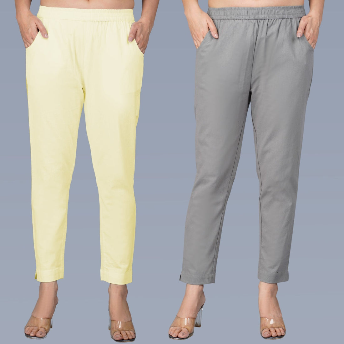 Pack Of 2 Womens Regular Fit Cream And Grey Fully Elastic Waistband Cotton Trouser