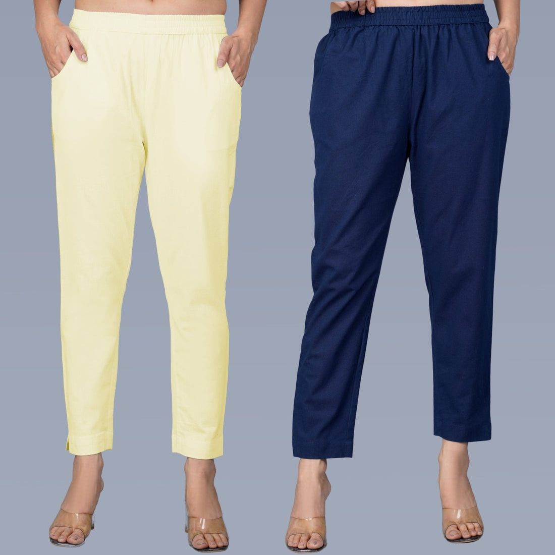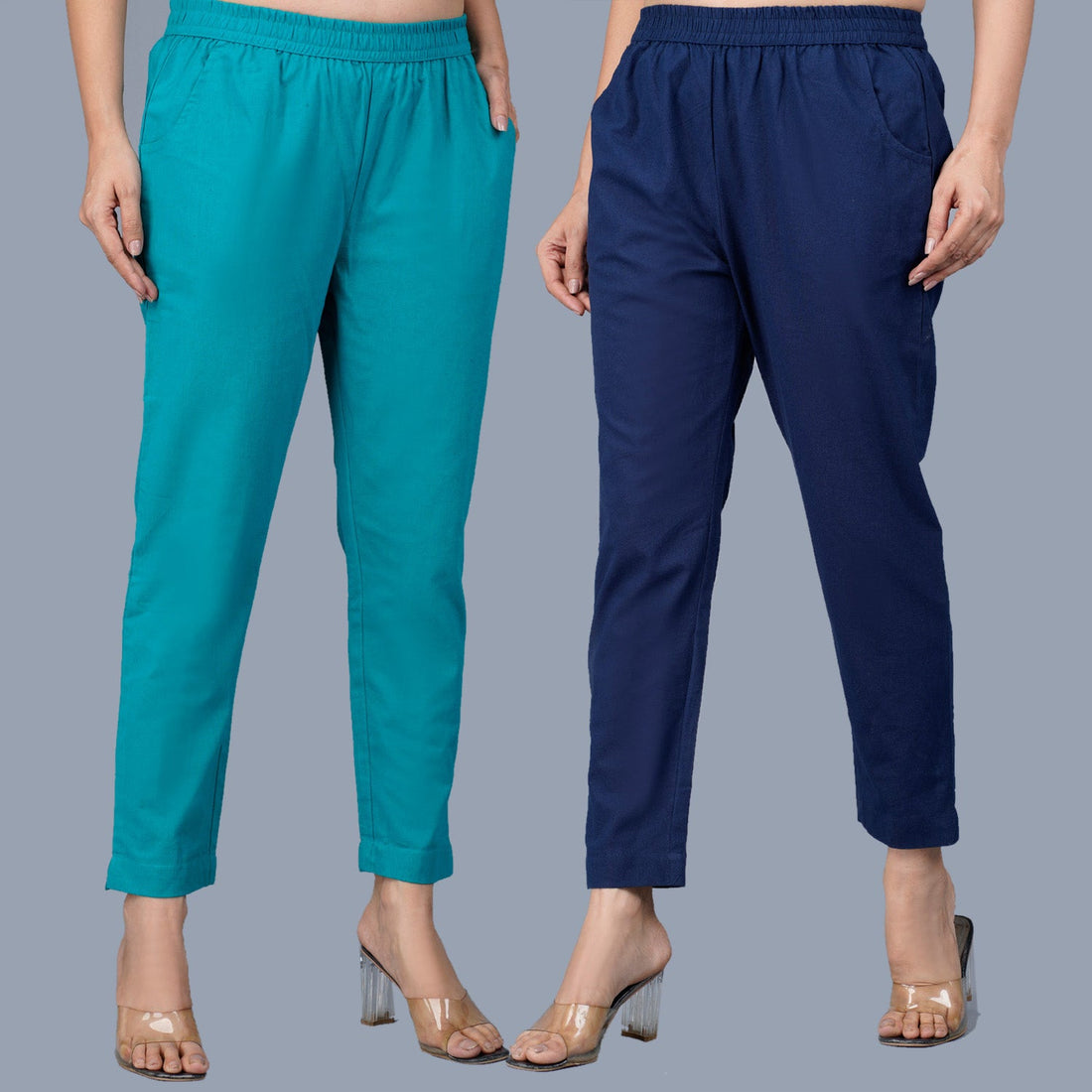 Pack Of 2 Womens Regular Fit Cyan And Navy Blue Fully Elastic Waistband Cotton Trouser