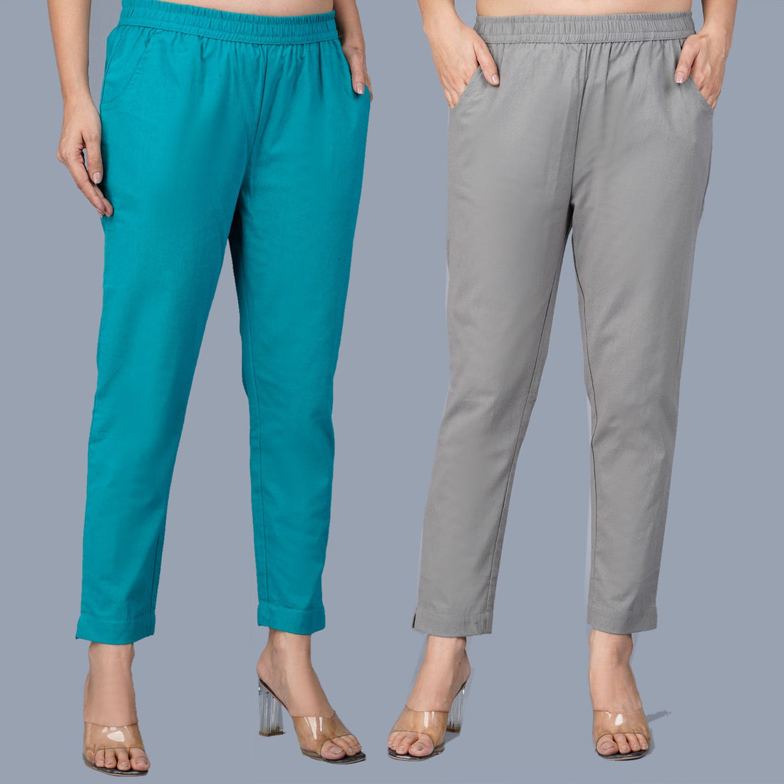 Pack Of 2 Womens Regular Fit Cyan And Grey Fully Elastic Waistband Cotton Trouser