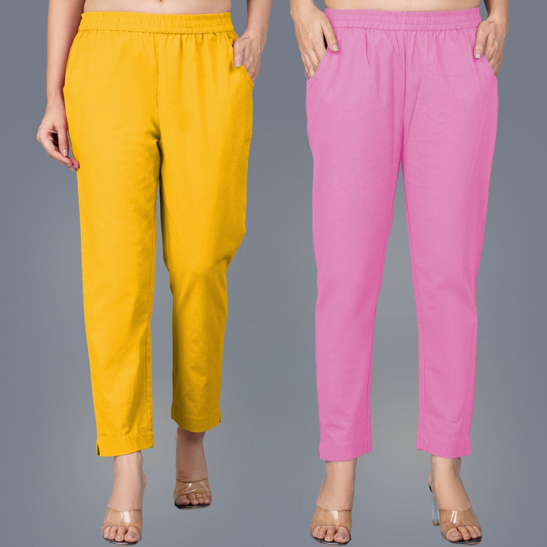 Pack Of 2 Womens Regular Fit Mustard And Pink Fully Elastic Waistband Cotton Trouser