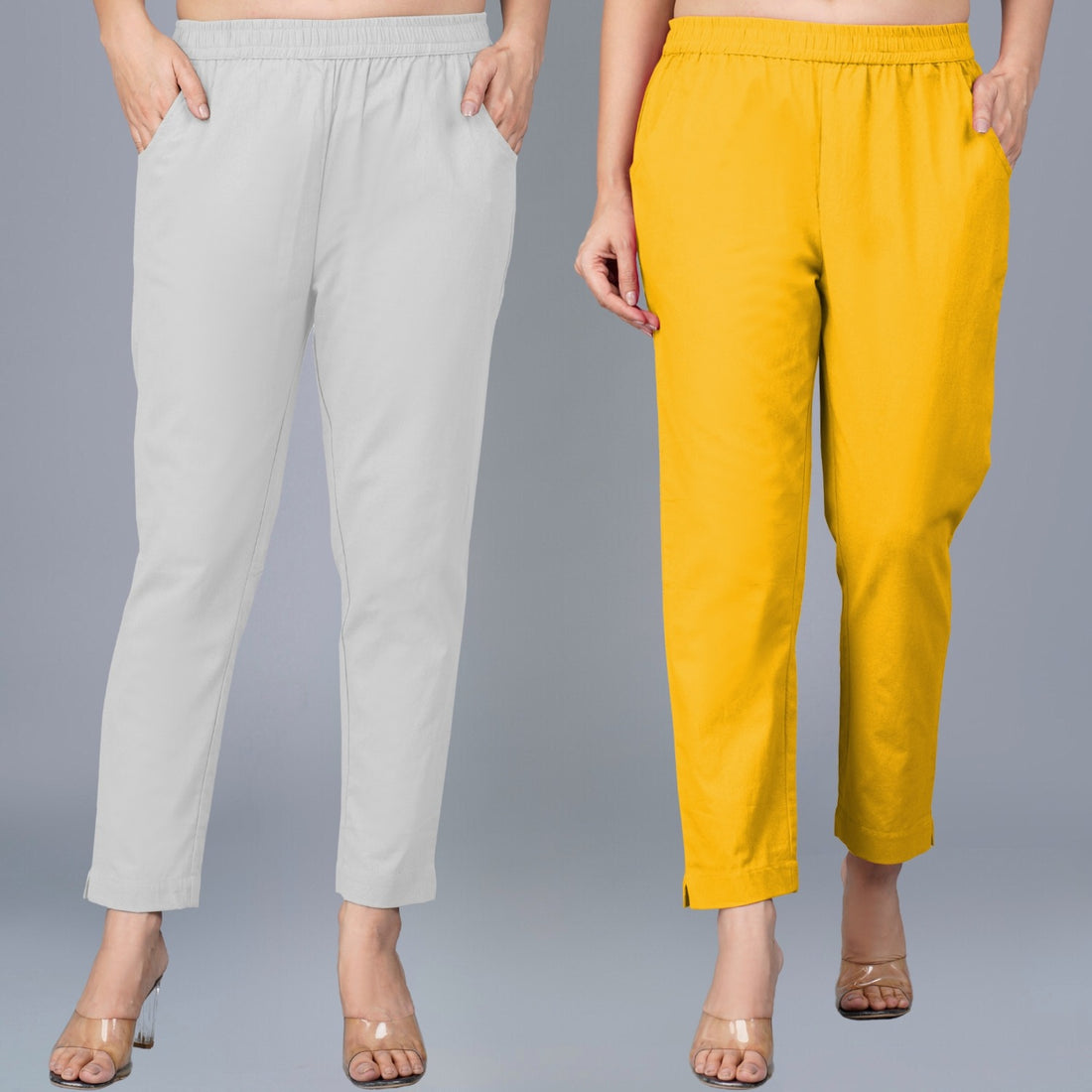 Pack Of 2 Womens Regular Fit Melange Grey And Mustard Fully Elastic Waistband Cotton Trouser